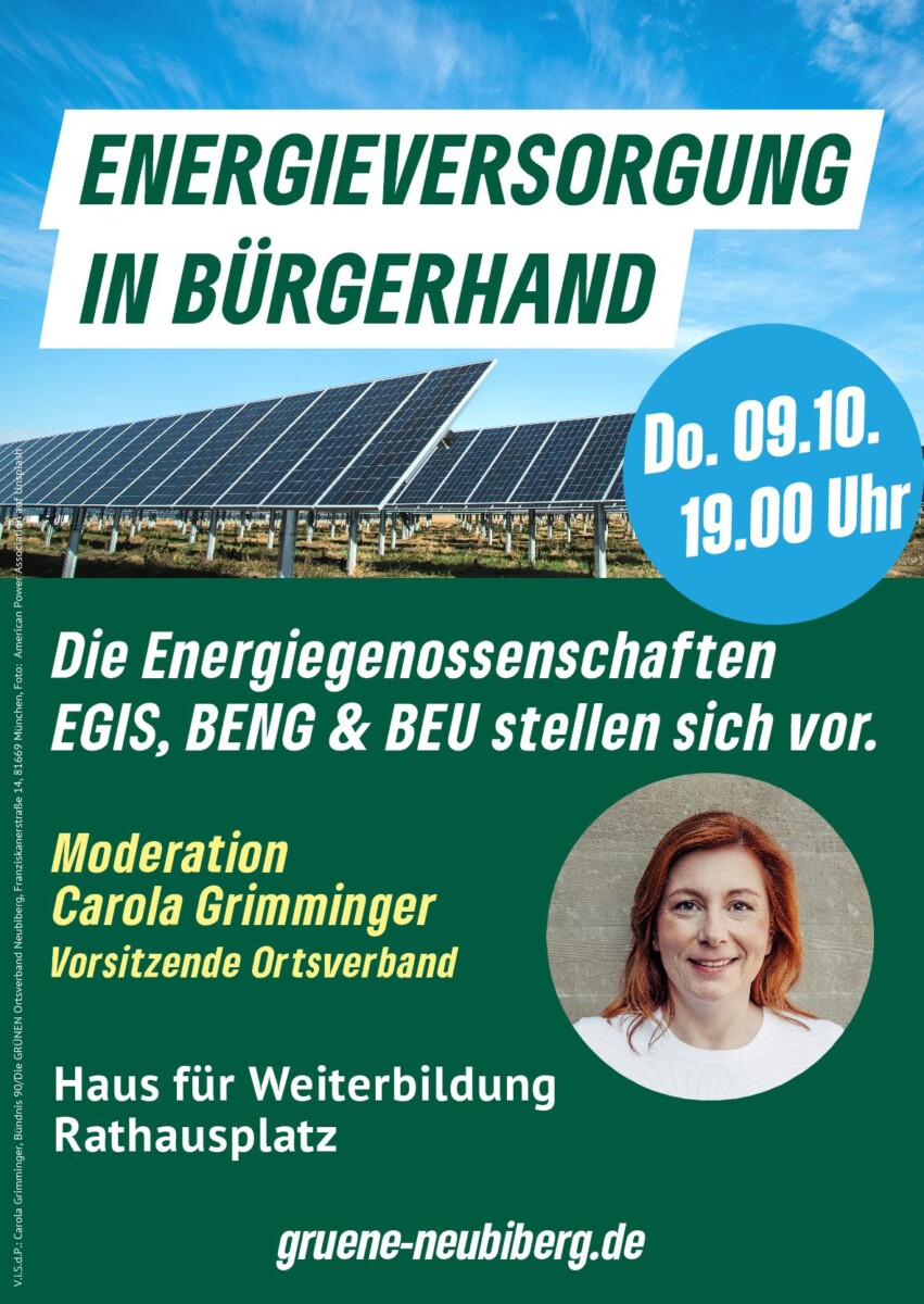 Neubiberg, 22. September 2025. Teure Energie, Abhängigkeit von Konzernen,Klimakrise – es braucht neue Wege. Die Grünen Neubiberg laden deshalb am Donnerstag, 9. Oktober 2025, um 19 Uhr ins Haus für Weiterbildung ein: Beim Infoabend „Energie in Bürgerhand“ zeigen regionale Energiegenossenschaften, wie Bürgerinnen und Bürger selbst Teil der Energiewende werden können.